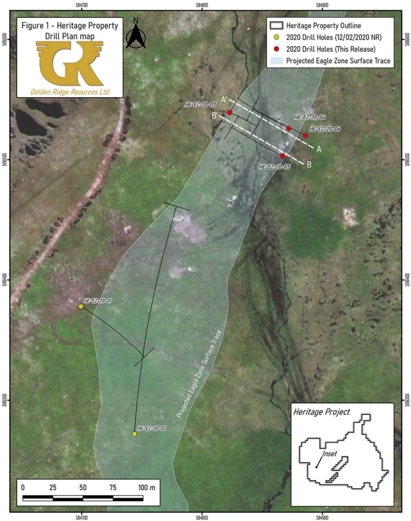 Golden Ridge Continues to Drill Near Surface Silver and Gold Mineralization at the Heritage Project; Hole HE-EZ-20-05 Intersects 24.20 Metres of 122.67 g/t AgEq
