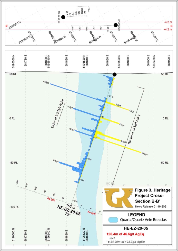 - HE-EZ-20-05 shows lateral continuity with the high-grade Ag-Au mineralization within the central part of the Eagle Zone, including multiple intervals of robust epithermal boiling-zone alteration and mineralization.