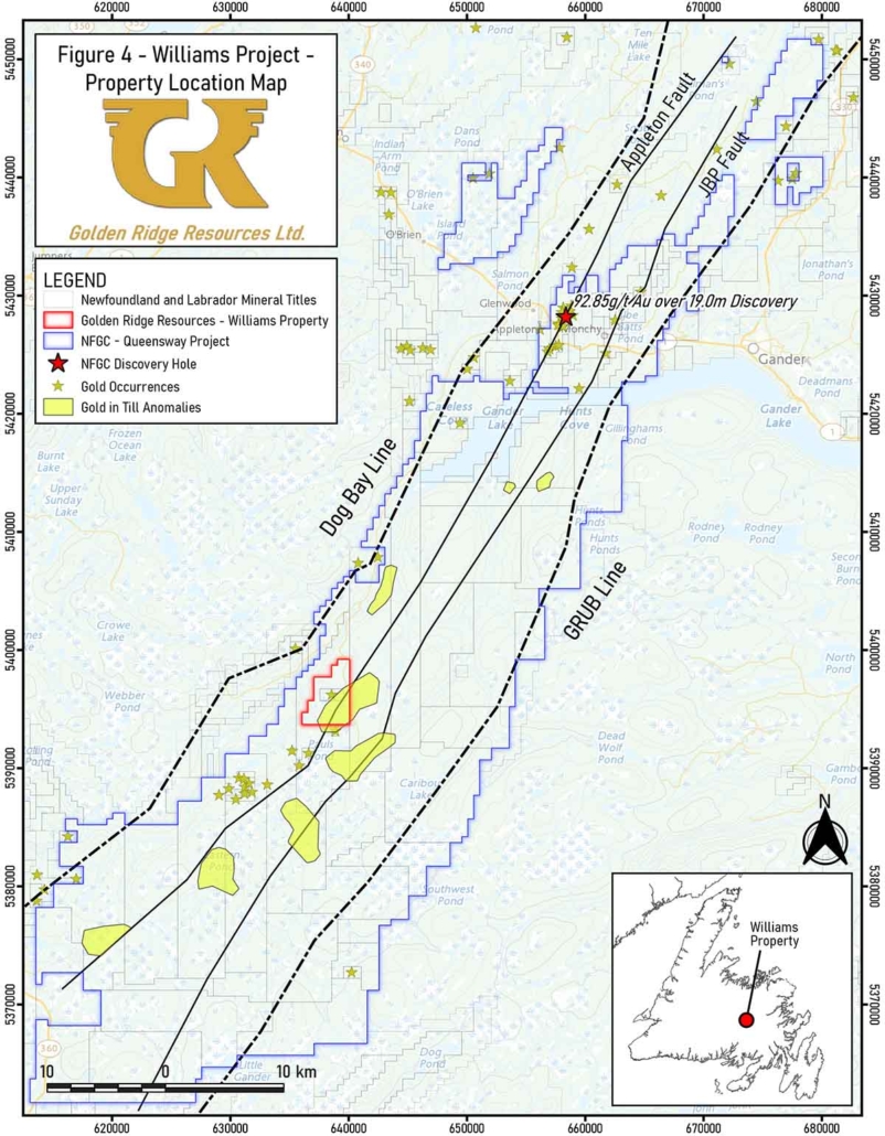 Kelowna, British Columbia – August 12, 2020 – Golden Ridge Resources Ltd. (“Golden Ridge” or the “Company”) (TSXV: GLDN) is pleased to announce inaugural exploration plans for its recently acquired Newfoundland property portfolio (see news release dated June 26th, 2020). The Phase I exploration program will focus on the Williams and Heritage projects. Immediately following the completion of the Phase I program, a Phase II diamond drilling program will be initiated which is designed to test current and new targets generated from the Phase I program results.