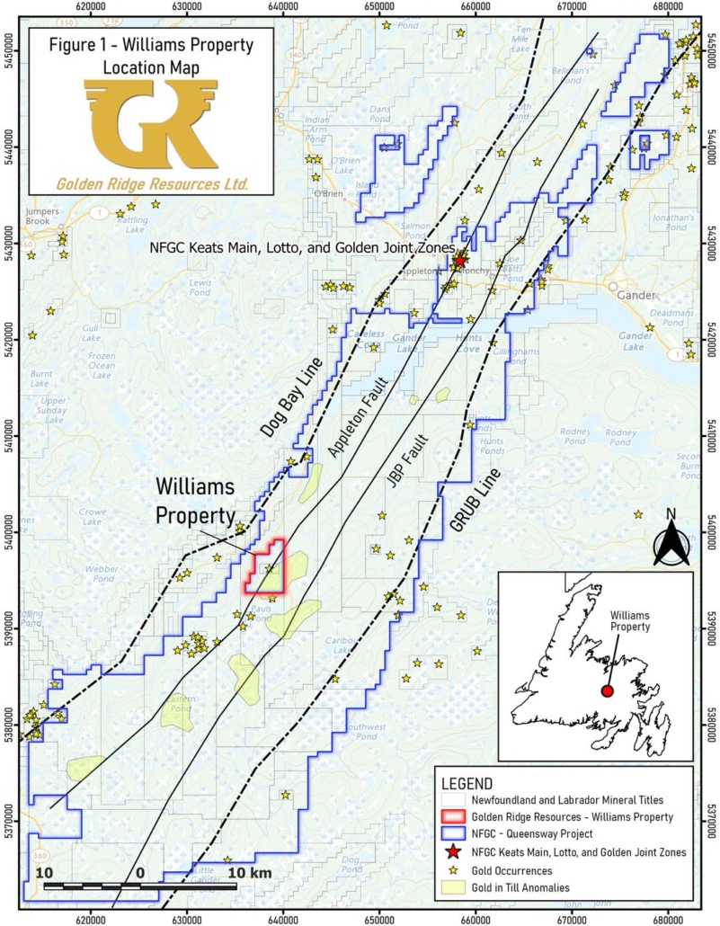 Kelowna, British Columbia – September 14, 2022 – Golden Ridge Resources Ltd. (“Golden Ridge” or “the Company”) (TSXV: GLDN) is pleased to announce commencement of a 5,000m drilling program at the Williams Gold Property (“Williams” or “the Property”), that is surrounded by New Found Gold Corp (NFGC)’s Queensway South Gold Property in the Central Newfoundland Gold Belt of the province of Newfoundland and Labrador (Figure 1).1 The maiden diamond-drilling program at Williams is focused on robust gold anomalies in soil and in trenches in the south and central portions of the property. Extensive prospecting, high-density soil sampling, and trenching were conducted during the 2021 and 2022 field seasons and highlighted strong anomalies within the Appleton and Dog Bay Fault Corridors. High-density soil sampling conducted in 2022 successfully extended soil anomalies identified during the 2021 field program, as well as detecting potential parallel mineralized zones.