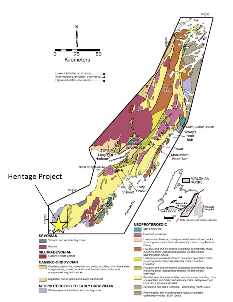 Figure 1. Regional geology map of the western Avalon Zone of Newfoundland, with key epithermal prospects indicated (modified from Sparkes and Dunning, 2014; O’Brien et al., 1998).
