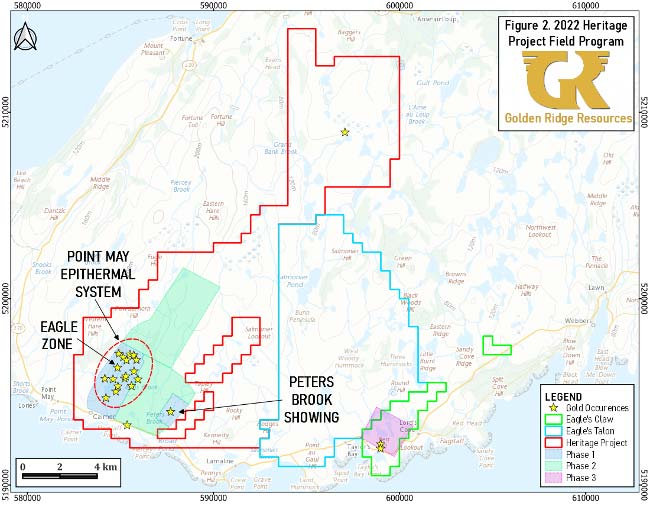 Kelowna, British Columbia – September 29, 2022 – Golden Ridge Resources Ltd. (“Golden Ridge” or “the Company”) (TSXV: GLDN) is pleased to announce commencement of a 2,500 station, till geochemistry program at the Heritage Project (“Heritage” or “the Property”), located within the underexplored Burin Peninsula Epithermal Gold/Silver Belt in southern Newfoundland. Several high- and low-sulphidation epithermal systems have been identified throughout the Burin Peninsula Epithermal Belt (Figure 1).1 Gold and silver mineralization within the Heritage Project area was first discovered in 2010 and early outcrop and float samples returned assays of up to 117 g/t gold in one sample, and 72 g/t gold and 1,168 g/t silver in another.2 Exploration since 2010 has resulted in the discovery of numerous additional mineralized showings throughout the 22,875-ha Heritage Project area, including the Eagle Zone , 500m in strike length, within the Point May Epithermal System (Figure 2). In 2020 Golden Ridge completed 5,182m of drilling on Property, focused on the Eagle, Turpin, and Pinnacle Zones (all within the Point May Epithermal System) with broad and narrow mineralized intersections including 305 metres of 21.2 g/t Ag and 0.3 g/t Au and 3.36 metres of 202.33 g/t Ag and 4.59 g/t Au (see December 2, 2020, News Release; Table 1).3
