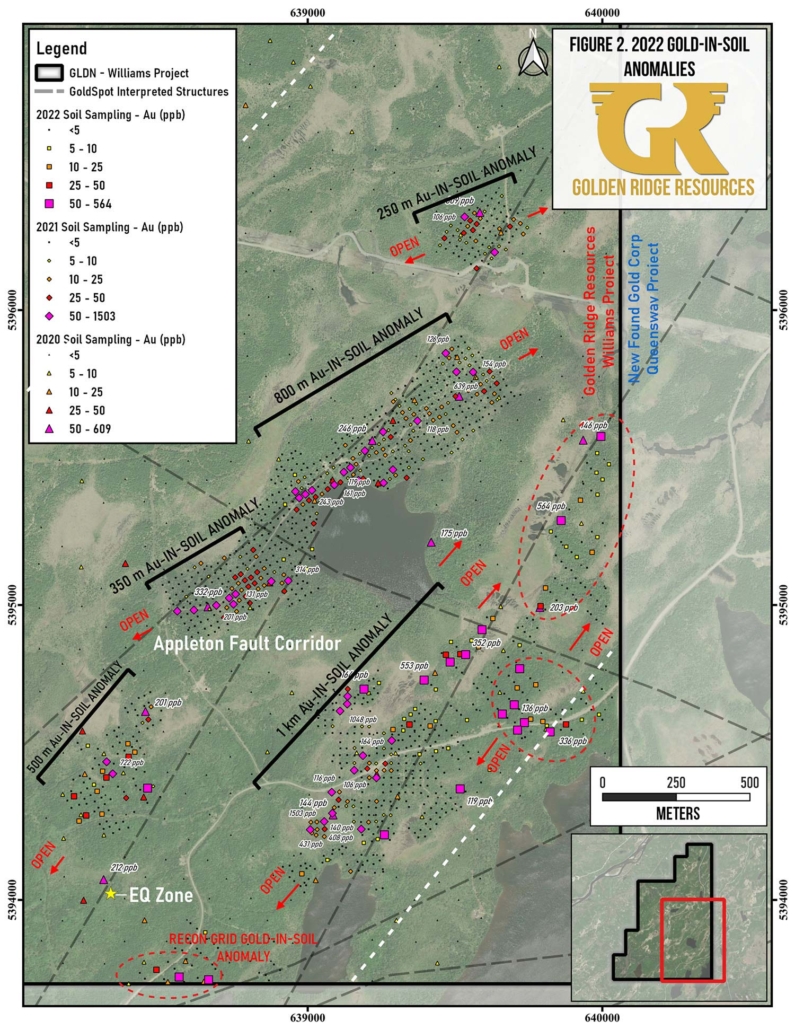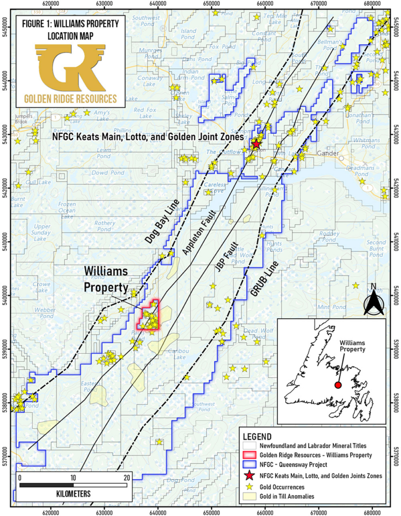 Kelowna, British Columbia – February 6, 2023 – Golden Ridge Resources Ltd. (“Golden Ridge” or “the Company”) (TSXV: GLDN) is pleased to announce the completion of the maiden 4,185m drill program on the Williams Gold Property (“Williams” or “the Property”) within the Appleton and Dog Bay Fault Corridors. The Property is surrounded by New Found Gold Corp (NFGC)’s Queensway South Gold Property in the Central Newfoundland Gold Belt, where the inaugural drill program of 7,254m was completed in 2022 (Figure 1, see New Found Gold Corp. December 28, 2022 Press Release).1 Golden Ridge’s diamond drill program tested numerous robust gold anomalies, in soil and trenches, in the south and central portions of the Property. The drill program followed up two successful field seasons in 2020 and 2021, which included extensive prospecting, property-wide and focused infill soil sampling, and follow-up trenching.