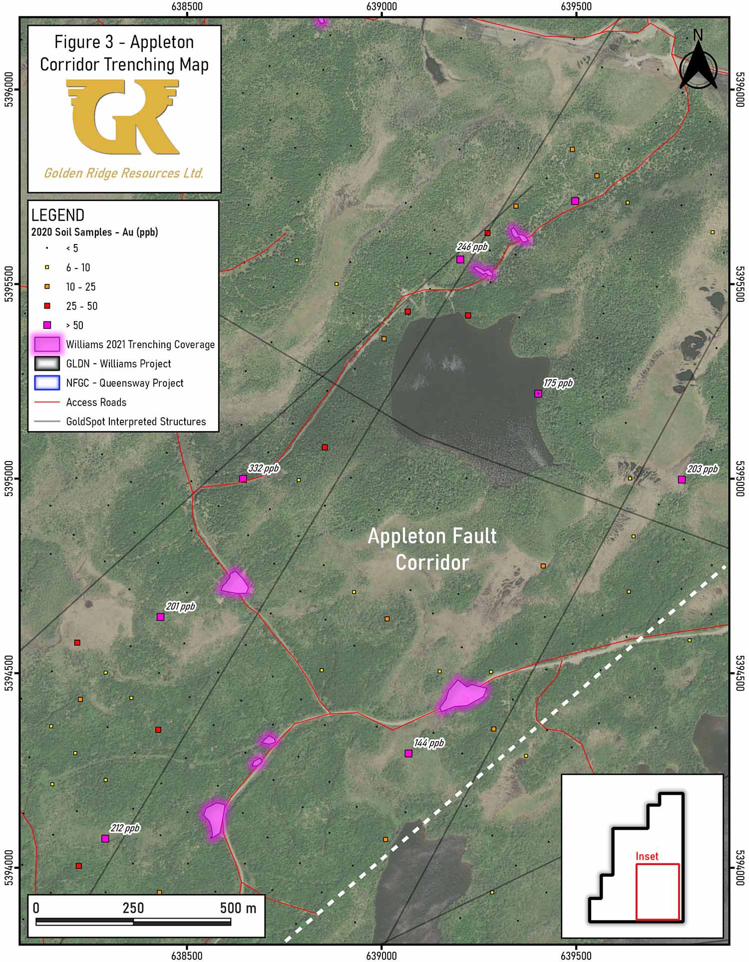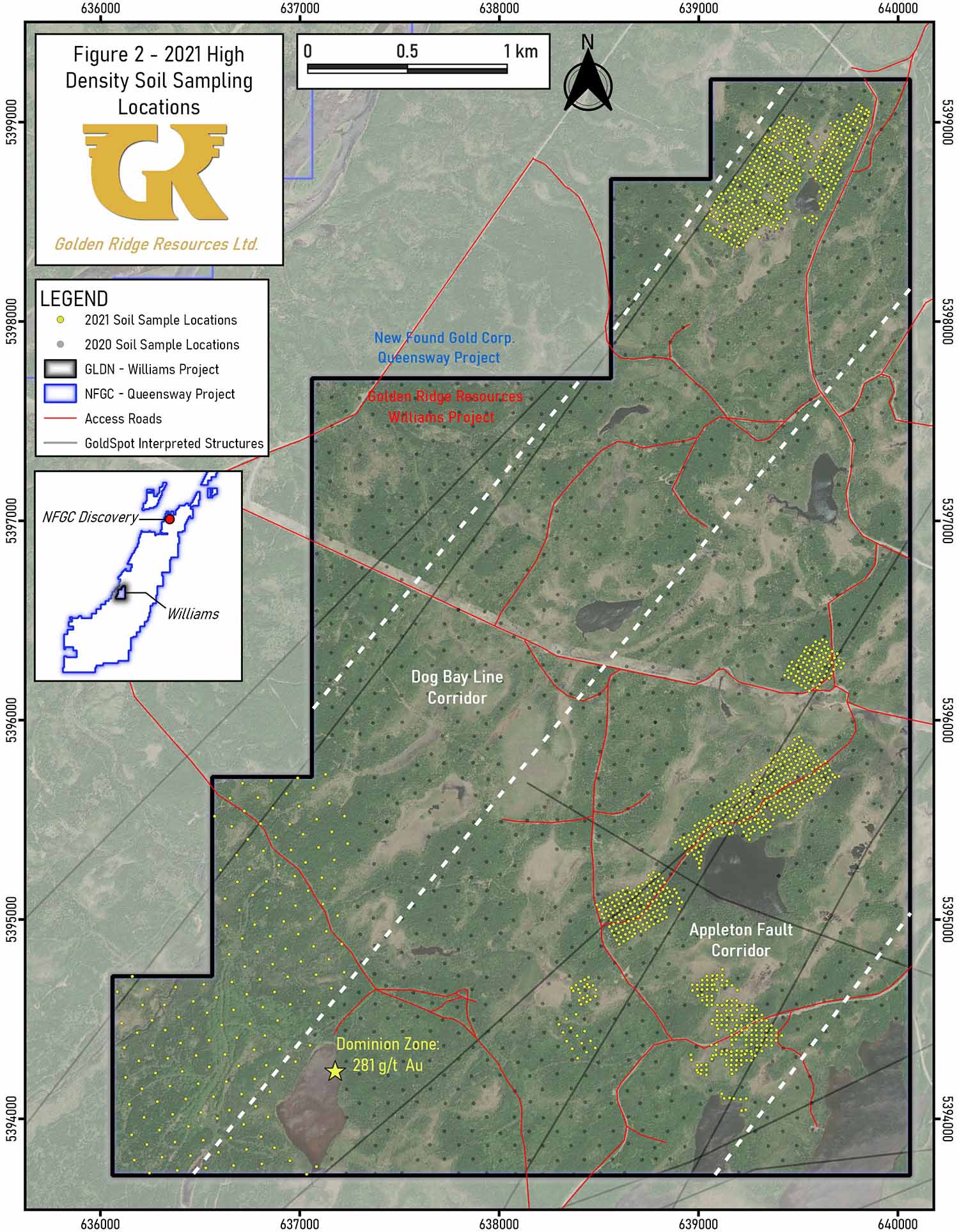 Mike Blady, Director, CEO & President of Golden Ridge stated “The high-grade float sample taken at the Dominion Zone shows the potential for high-grade gold within the Williams Property and throughout the South Queensway Area. We are continuing to uncover and define the potential for high-grade gold mineralization across the Williams Gold Property, where very limited historical work has been done. Using the trenching, and geochemical soil-sampling data, from 2021 we will continue to vector towards the high-grade sections of the Dog Bay and Appleton Fault Corridor. Upon receipt of assays we will be able to effectively and quickly follow up these targets early in 2022.”