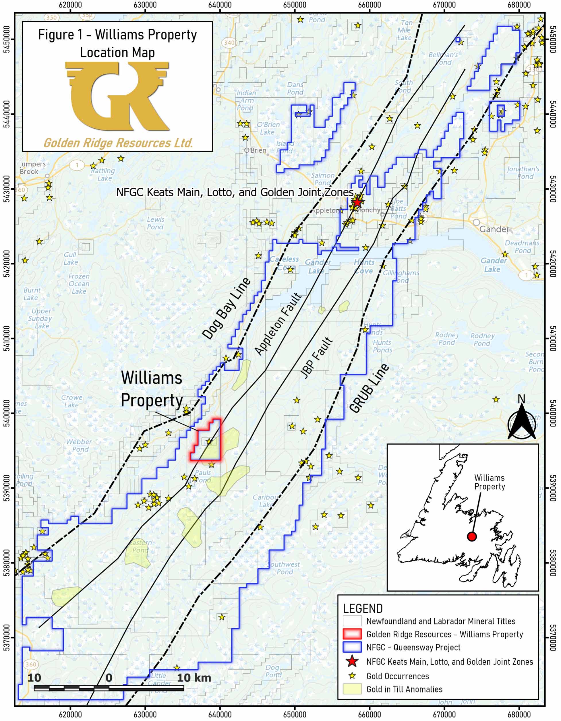 Mike Blady, Director, CEO & President of Golden Ridge stated “The 2021 field program yielded numerous gold anomalies along both the Dog Bay and Appleton Fault Corridors. Prospecting, trenching, and high-density soil sampling all helped to explain the relationship between gold in soil and in bedrock. Golden Ridge plans to aggressively continue to expand the gold-in-soil anomalies early in the season, to create as much targeting data as possible to guide the drilling. The maiden diamond drill program will systematically test these anomalies and raise the profile of the underexplored Williams Gold Property, within the exciting Central Newfoundland Gold Belt.”