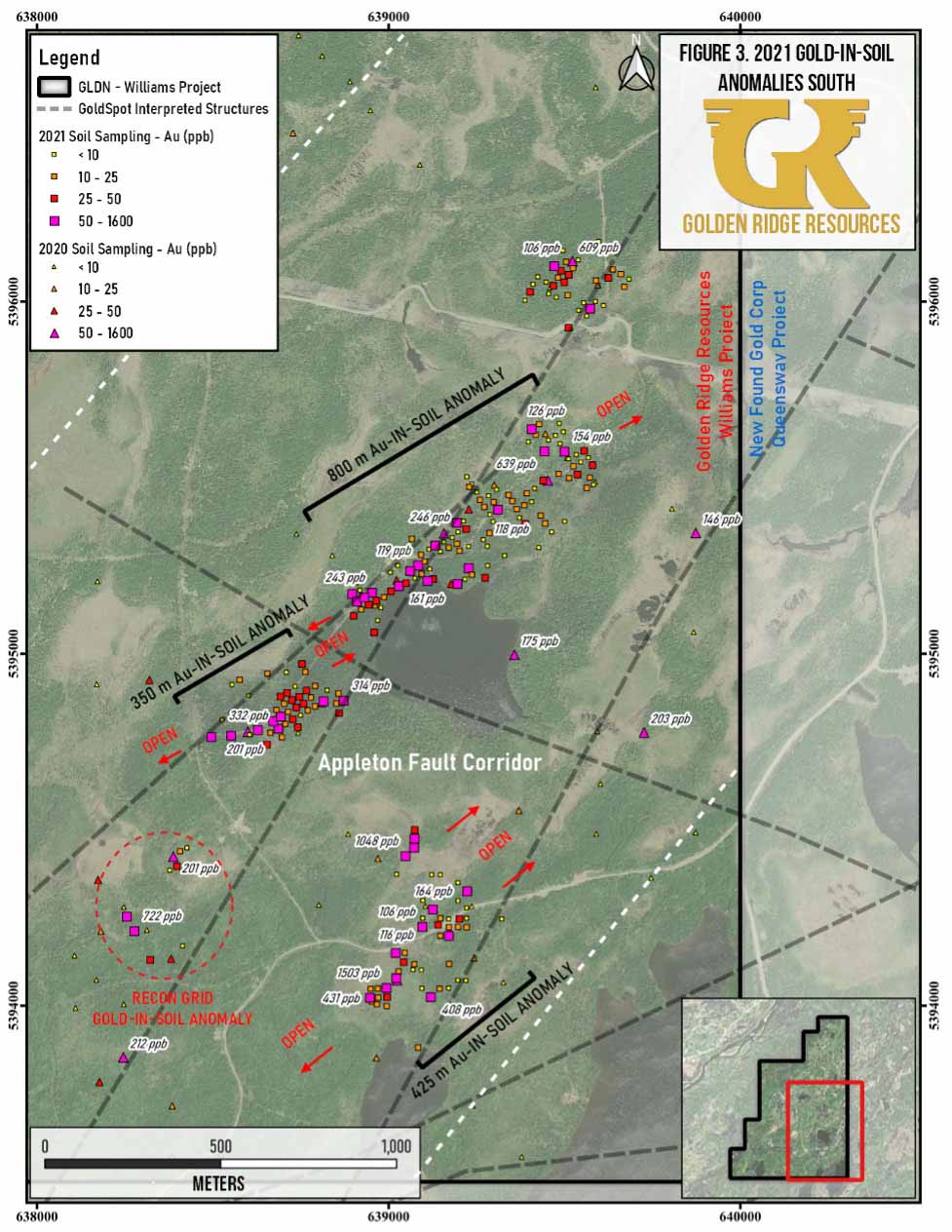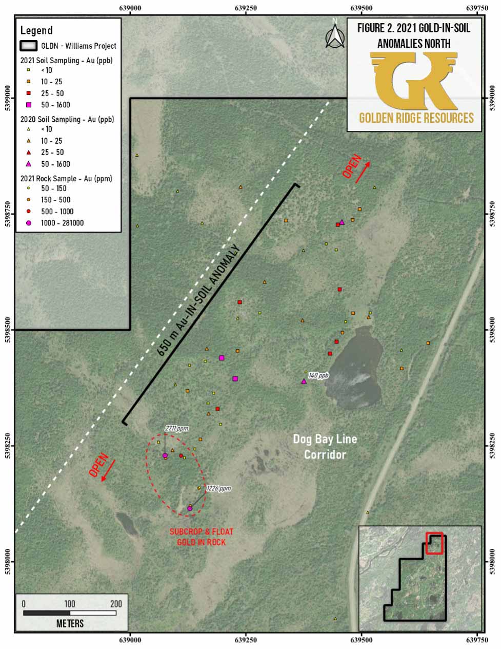 The final assays 430 (of 1,316) soil samples, 51 (of 305) chip and channel samples, and 28 (of 208) grab samples from the 2021 field program have recently been received by Golden Ridge. The 2021 field program had previously highlighted soil anomalies 800m, 425m, and 350m long, which remain open along strike and include values up to 1.50 g/t and 1.05g/t Au in soil (see March 10, 2022 news release). The final batch of assays from the 2021 field sampling program contained numerous gold in subcrop and float grab samples in the northern Dog Bay Fault Corridor portion of the property, with up to 2.71 g/t and 1.23 g/t Au (Figure 2). These samples contain strong pyrite and arsenopyrite mineralization and were collected on the western edge of a 650m gold-in-soil anomaly identified during the 2021 field program. The 2021 field program noted gold mineralization and evidence of hydrothermal activity along the entire 5km of the Dog Bay Fault Corridor; in addition, historical float grab samples assayed up to 51.60 and 44.24 g/t Au. Soil sampling on smaller recon grids conducted in the Appleton Fault corridor to the west along strike of the large anomalies returned numerous anomalous gold-in-soil values up to 0.72 g/t Au (Figure 3). The Company plans to aggressively continue to soil sample along strike of these anomalies and also conduct drill testing.