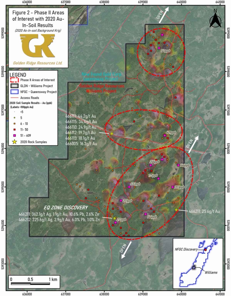 “We are very pleased to have received the trenching permit for the Williams Project located within the New Found Gold Corp’s Queensway Gold project. Golden Ridge will focus on prospecting and trenching outcrop and strong gold-in-soil anomalies defined by the successful Phase I exploration program completed in October 2020. The Phase II exploration program and follow-up trenching will help define key prospects for future drilling. We are encouraged by the continued success of New Found Gold, demonstrating the potential for the Central Newfoundland Gold Belt as a word-class gold district.” stated Golden Ridge CEO, Michael Blady.